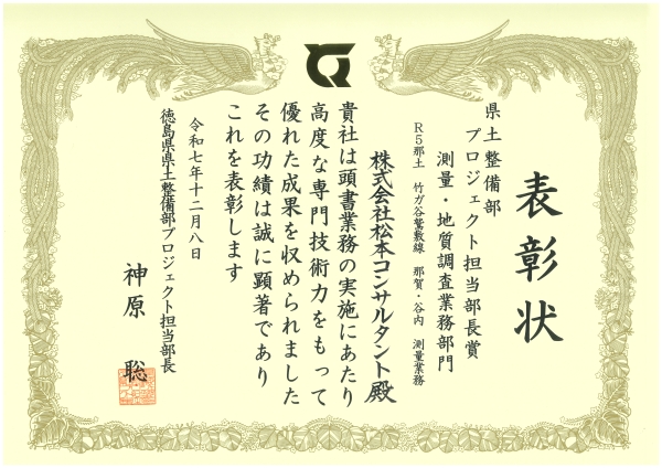 このたび、徳島県県土整備部プロジェクト担当部長様より、「優良業務表彰」(測量・地質調査業務部門)と、調査部吉本哲也が「優良業務技術者表彰」を受賞いたしました。